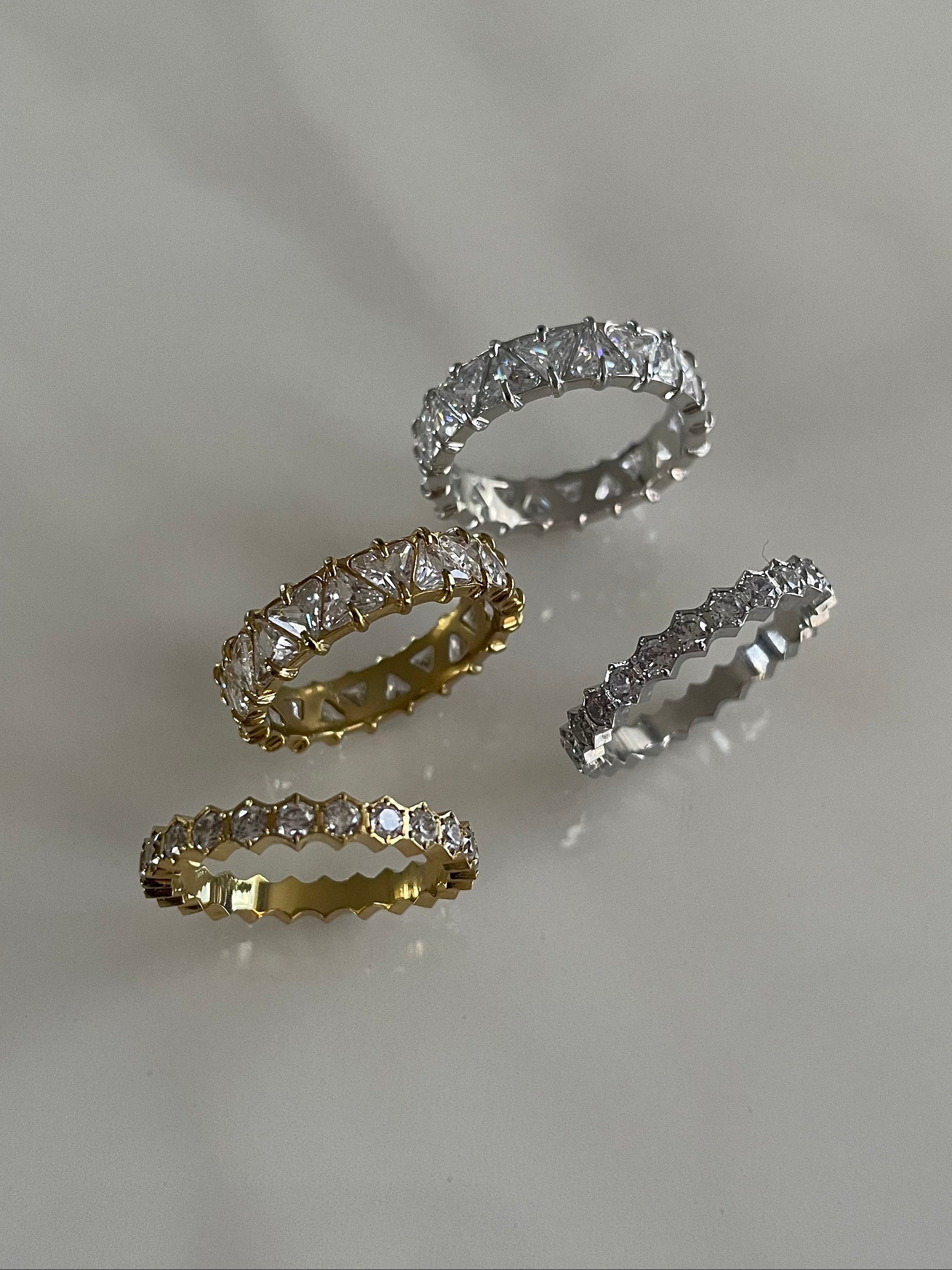 Crafted to catch the light from every angle, our Lumina rings are designed for effortless stacking or a bold statement worn on their own. Available in both silver and gold, each new piece adds timeless sparkle to your everyday style.